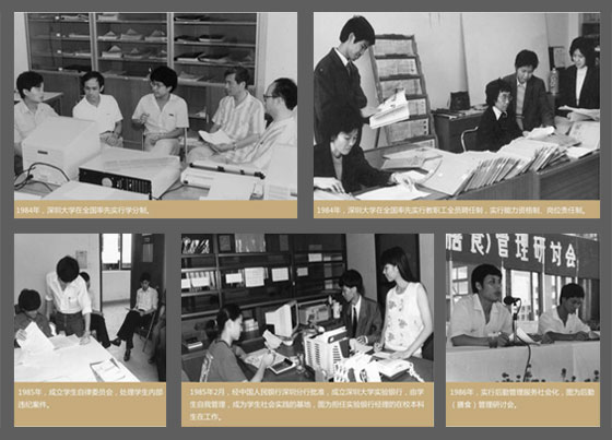 1984年至1986年,深圳大學先后開展兩次改革創新,以改革大學管理體制和提高教學質量為重點,推行不包分配、試行學分制、勤工儉學制度(創辦實驗銀行、實驗印刷廠、實驗郵局)、人事制度改革(實行全員聘任制度)等舉措。