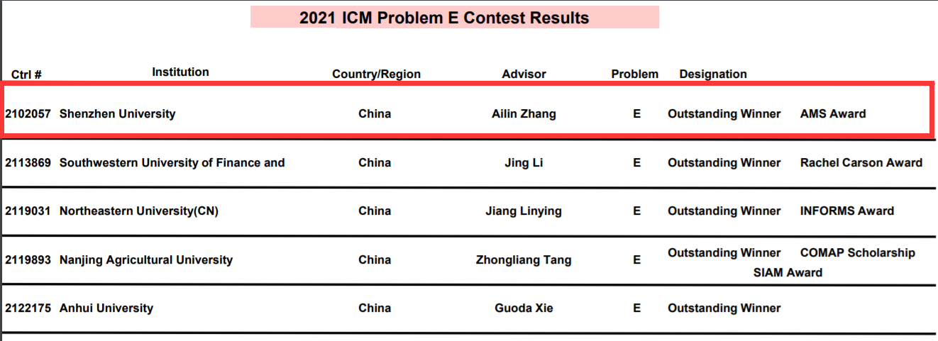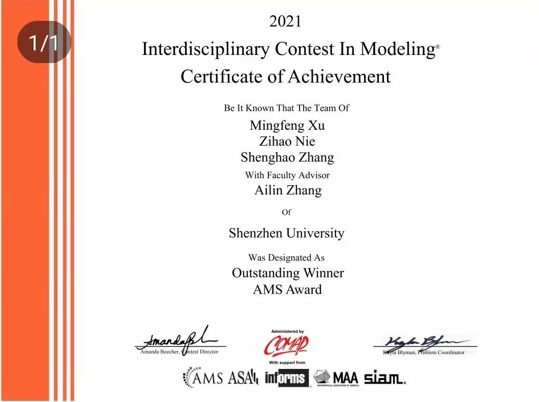 近日,2021年美國大學(xué)生數(shù)學(xué)建模競賽成績陸續(xù)揭曉。深圳大學(xué)高等研究院本科生憑借扎實的專業(yè)知識、出色的英文表達能力以及團結(jié)協(xié)作的精神斬獲特等獎(Outstanding Winner)1項,特等獎提名(Finalist)1項,優(yōu)異獎(Meritorious Winner)3項,榮譽獎(Honorable Mention)8項。其中由2019級理工創(chuàng)新實驗班本科生徐明鋒、聶子豪、張聲浩組成的隊伍(指導(dǎo)老師:張愛林)斬獲特等獎(獲獎比例小于1%)及美國數(shù)學(xué)學(xué)會特別獎,為深大唯一獲得特等獎的隊伍。