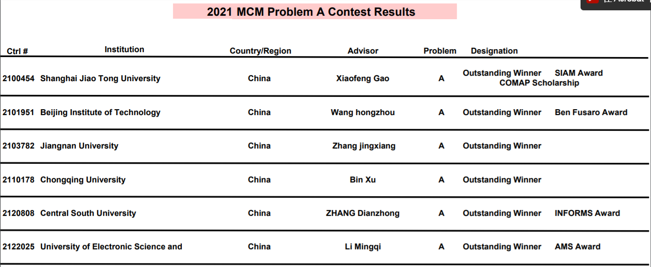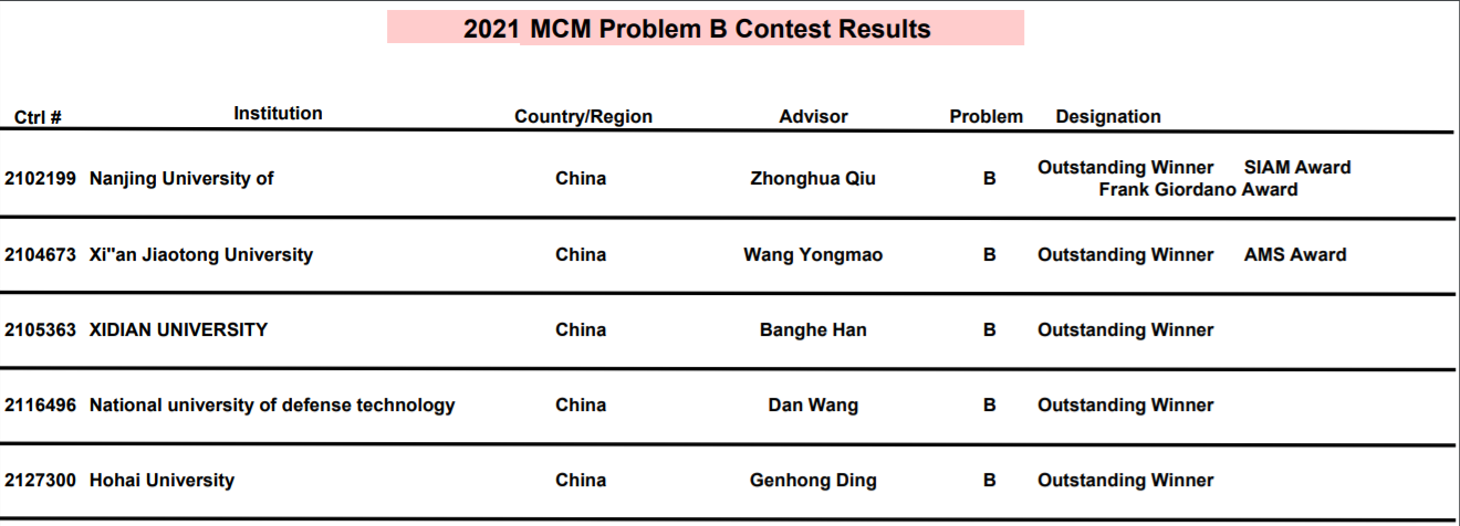 附:2021年美賽獲獎數(shù)據(jù)(引用自美賽官網(wǎng):https://www.comap.com/undergraduate/contests/mcm/contests/2021/results/