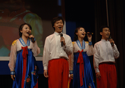 一曲動感的現代舞拉開了音樂會的序幕,在班主任張又丹美妙鋼琴聲的伴奏下,王玨以一首《火焰在燃燒》點燃了國際會議廳所有聽眾心頭的音樂火焰;蔣波蘭把《長鼓敲起來》唱得起伏有致婉轉動聽,在座師生沉醉在美妙的音樂中,如同在白云藍天綠草如茵上縱馬馳騁;四個帥小伙用一曲輕松詼諧的四重唱《回娘家》又把聽眾帶進了歡樂之鄉;隨后趙幸梅的一首《清凌凌的水來藍瑩瑩的天》把人從歡樂之鄉中帶進音樂天堂;頗有朝鮮族風味的《阿里郎》的優美的和聲讓人心曠神怡;在隨后鋼琴獨奏中,黃希陶用一首《百鳥朝鳳》讓大家明白了天籟之音的含義;莫扎特的《奏鳴曲K521》在輕快的小響板中把人們帶到了充滿異國風情的歐洲;彭佳同學演唱《紅月亮》時在臺上載歌載舞,美妙的歌聲配上優美的舞姿,讓人充分體會到了音樂的魅力。最后,24名同學共登舞臺,同唱《夢想實現點》,音樂晚會在美妙的歌聲中拉下帷幕。