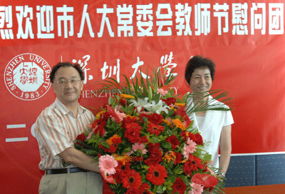 慰問團(tuán)向深圳大學(xué)贈送書有“崇教厚德,為人師表”的牌匾,并向優(yōu)秀教師代表送上鮮花和禮物,表達(dá)市人大常委會和全市人大代表的良好祝愿和崇高敬意。深大學(xué)生則向前來慰問的身為教師的市人大代表獻(xiàn)上鮮花。