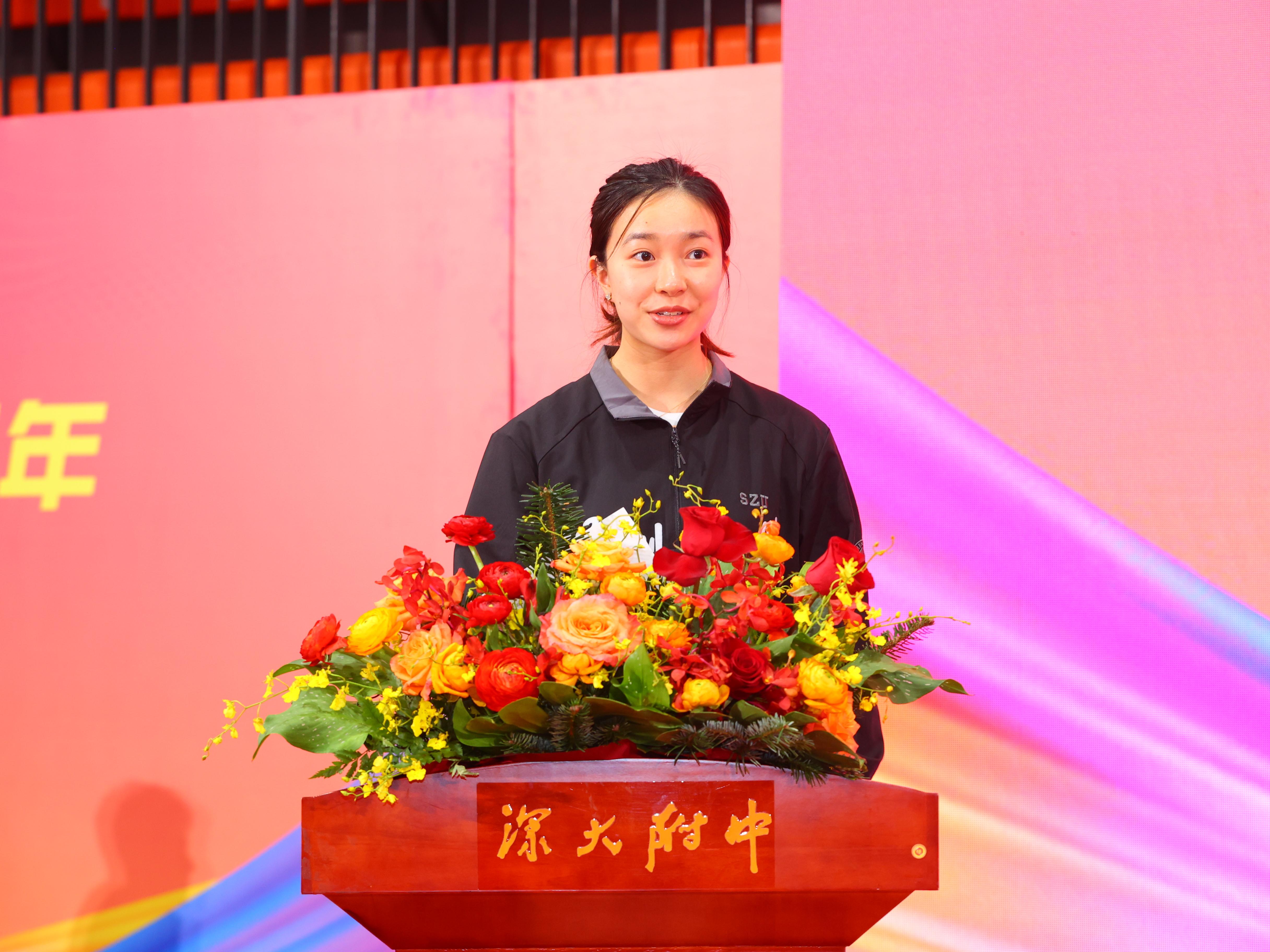 在演講中,孫穎莎表示此次是第二次來到深大附中,“故地重游,心中倍感親切”。她回憶,自己上一次走入深大附中的校園,是在2017年12月17日,距今已經整整7年。孫穎莎表示,7年里發生了很多變化,自己從“首次參加成人組賽事、剛剛加入國家隊一隊、比賽時難免會緊張焦慮”的小將,成長為“級別再高的比賽都能全力以赴,從容面對”的主力。同時她表示,也有很多事情是始終不變的,比如“對于夢想的執著追求”。孫穎莎說:“七年前的我沒想過自己能取得怎樣的成績,只是對乒乓球的熱愛牽引著我一直向前。而現在,我越發明白,比賽拼的不止是一個人的勝負。每當我取得出色戰績的時候,總會聽到球迷對我說:祖國會為你驕傲的!這句話時常在我耳邊回響,就像是一句囑托。無論順境逆境,它都給了我勇往直前的勇氣。有強大的祖國作為我的后盾,我也有了更多追逐夢想的底氣。”