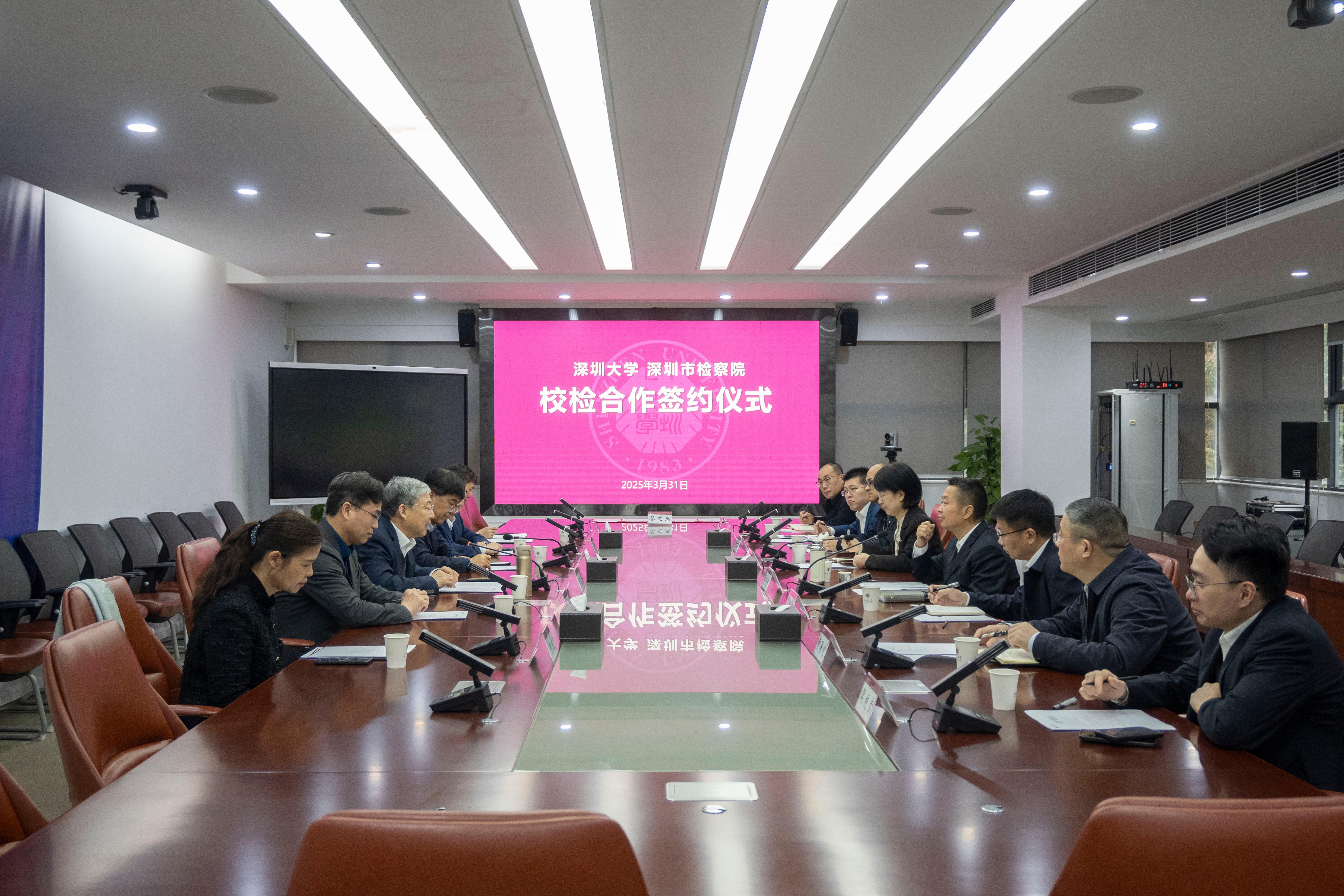 3月31日上午,深圳大學與深圳市檢察院“校檢合作”簽約儀式在粵海校區匯元樓舉行。深圳大學黨委書記李清泉、副校長汪永成;深圳市檢察院黨組書記、檢察長李小東,黨組成員、政治部主任張麗出席簽約儀式。