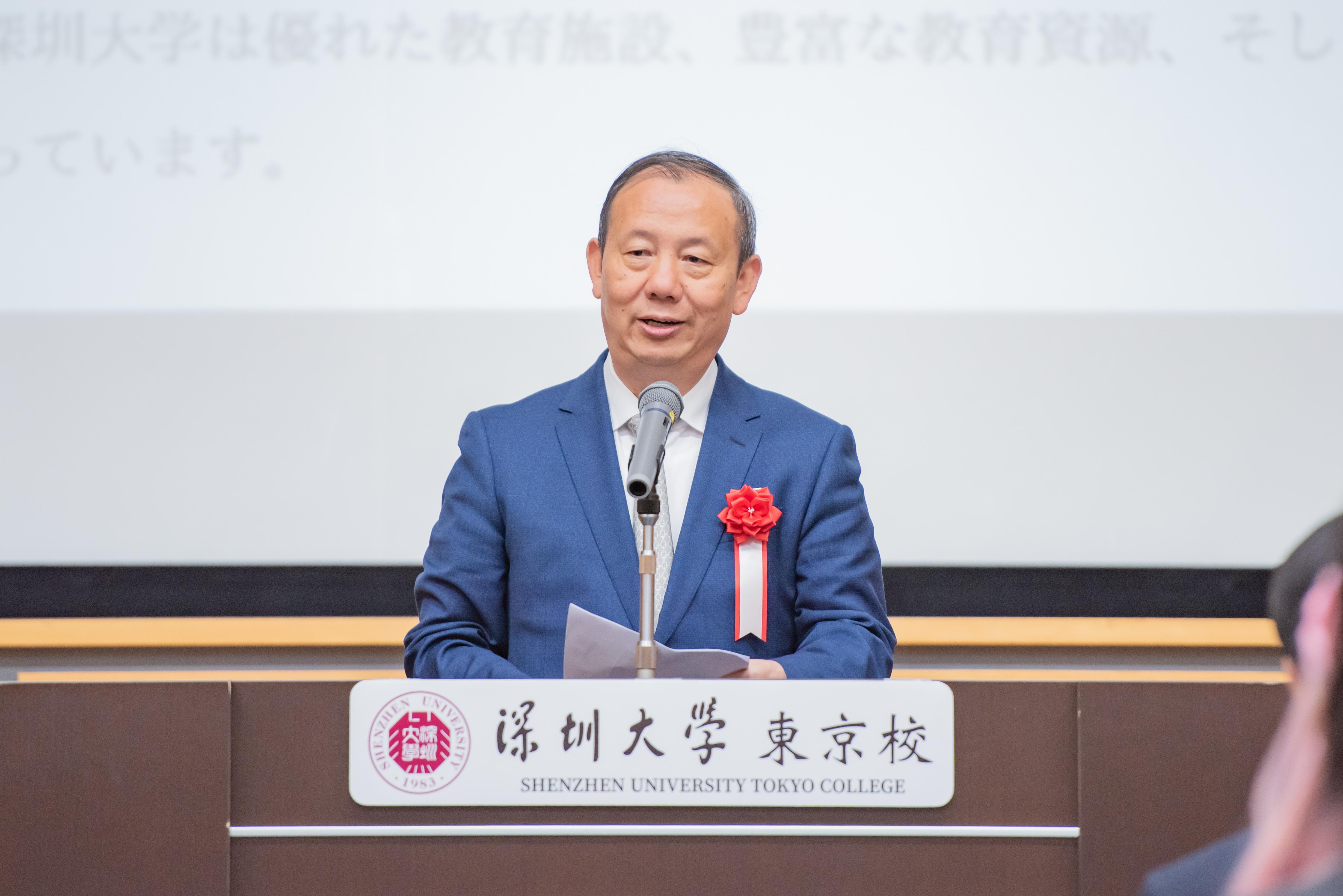 毛軍發代表深圳大學向新同學表示歡迎和祝賀,向支持東京學院發展的家長、企業代表、老師以及社會各界人士表示感謝。他表示,深圳大學是深圳規模最大的高水平綜合性大學,與深圳這座特區城市共同成長,與粵港澳大灣區的經濟發展、科創基因和奮進精神高度融合,成為全球發展最快的大學之一。東京學院是深圳大學在境外舉辦的第一個辦學機構,開辦兩年以來發展迅猛,得到各方肯定和贊賞。毛軍發對新生寄予期望,勉勵他們胸懷壯志,勇攀高峰,傳承創新基因;放眼全球,胸懷天下,成為跨文化溝通的實踐者;腳踏實地,躬身實踐,以深大人的“三自精神”為底色,成為真正的實干家。“東京學院是你們夢想起航的地方,也是你們走向世界的舞臺。”他希望東京學院的師生們共同用努力書寫更加輝煌的明天。