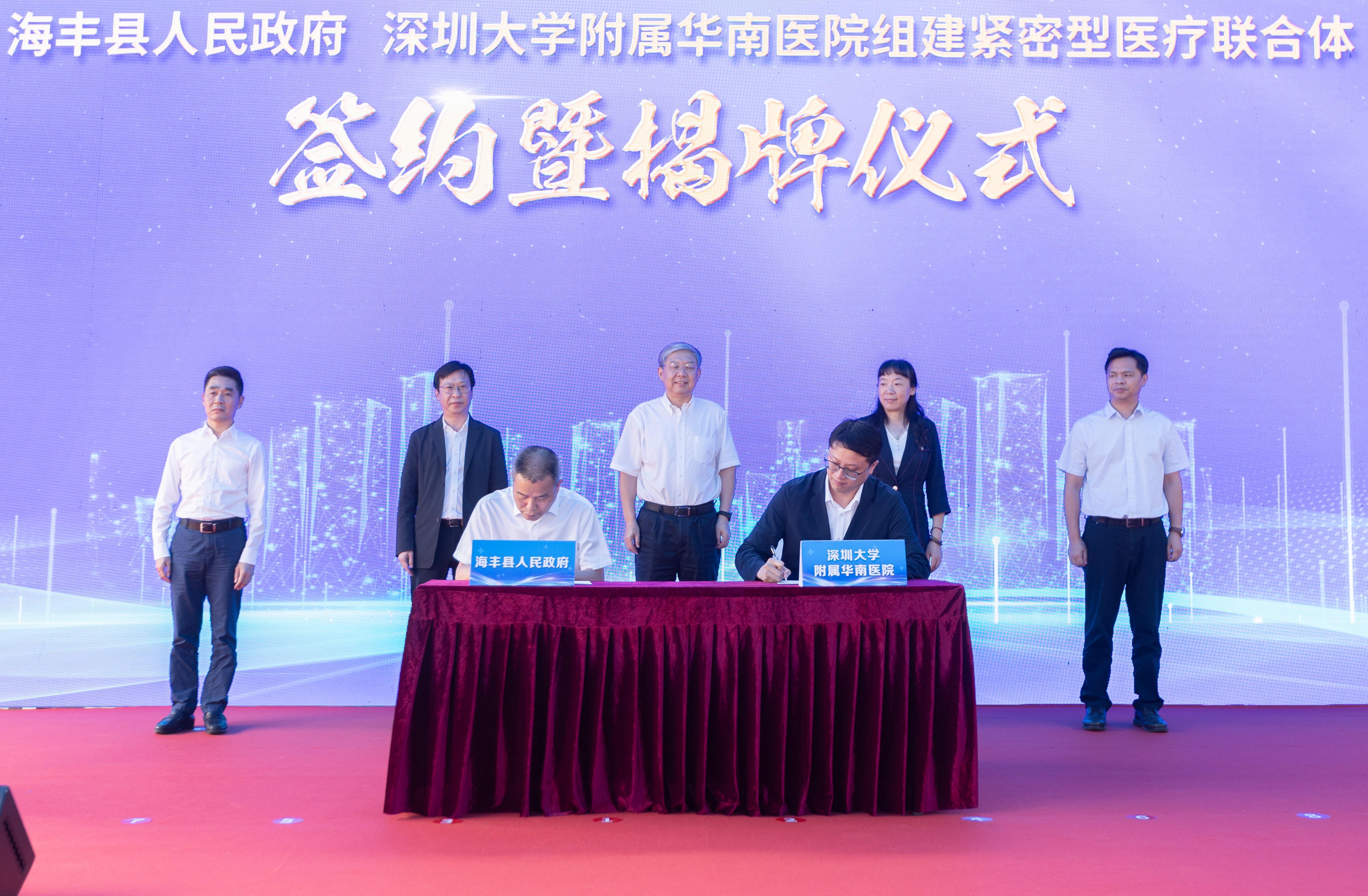 深圳大學黨委書記李清泉、汕尾市副市長莊紅琴、海豐縣委書記郭文炯,海豐縣委縣政府、人大常委會、政協(xié)和汕尾市衛(wèi)生健康局相關領導,深圳大學發(fā)展規(guī)劃部、深大華南醫(yī)院相關負責人,深圳大學駐海豐服務隊成員以及深大華南醫(yī)院17名專家教授出席簽約揭牌儀式。