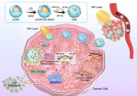 DNAzymes能夠特異性識別和切割特異性癌基因靶點,從而阻斷基因沉默治療中的蛋白質翻譯。由于其生物相容性、易于合成和高可編程性,DNAzymes在病毒感染、腫瘤和其他疾病的基因治療中得到了廣泛的探索。然而,基于DNAzymes的基因治療應用的一個主要瓶頸是,如何實現基因沉默的時空可控性。本研究開發了一種近紅外光(NIR)觸發的級聯納米系統,實現了級聯效應介導的氣體-基因協同治療,并證明了這種納米平臺在體外和體內均表現出良好的聯合抗腫瘤作用。該納米系統通過將上轉換納米顆粒(UCNPs)與一氧化氮(NO)前體結合,進一步利用靜電作用吸附具有apurinic/apyrimidinic endonuclease 1(APE1)酶激活能力的DNAzymes。UCNPs作為光轉換器,在NIR光照射下激發NO前體產生NO,而產生的NO不僅直接參與氣體治療,還將誘導細胞質中APE1水平的上調,從而增強DNAzymes的激活和時空可控的基因沉默。通過利用這一機制,將NIR光控制的NO釋放和APE1激活的基因治療的結合,實現了級聯效應介導的氣體-基因協同治療。