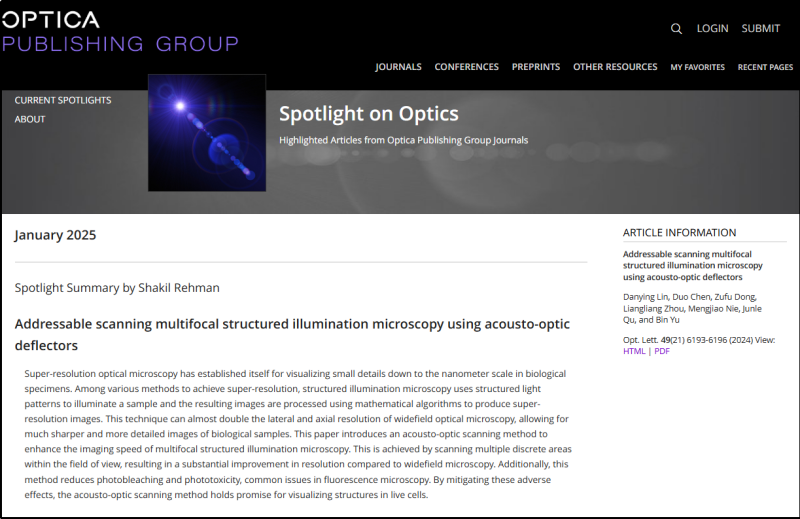近日,物理與光電工程學院生物醫學光子學研究中心超分辨成像課題組在光學類Top期刊《Optics Letters》上發表的題為《Addressable scanning multifocal structured illumination microscopy using acousto-optic deflectors》的研究論文,被美國光學學會評選為2025年1月份的Spotlight on Optics(即光學亮點文章),并進行了相關評論。深圳大學為論文第一完成單位和通訊作者單位,生物醫學光子學研究中心超分辨成像課題組林丹櫻教授為第一作者和共同通訊作者,于斌教授為共同通訊作者,中心主任屈軍樂教授和碩士研究生陳鐸等為共同作者。研究工作受國家自然科學基金、廣東省基礎與應用基礎研究基金等項目資助。