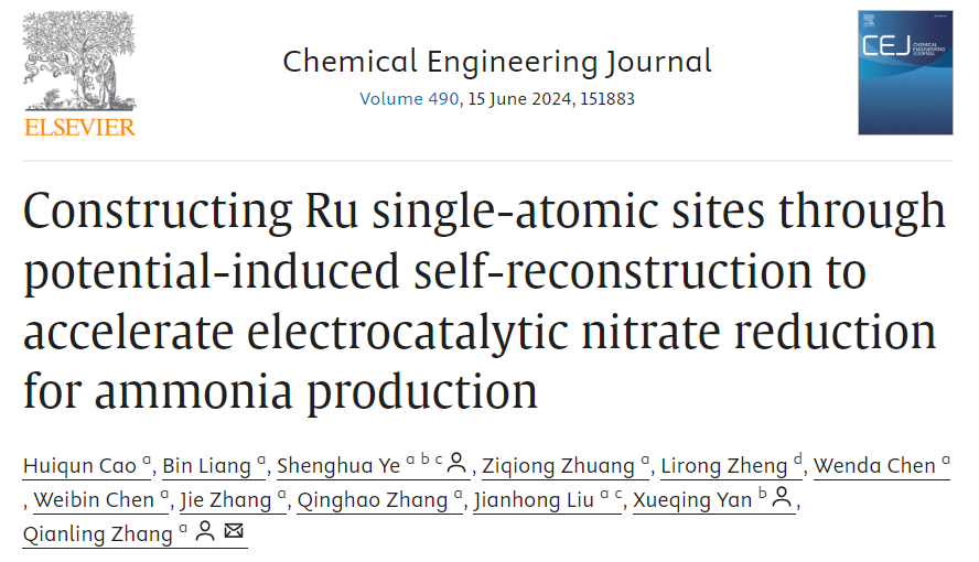 3、深圳大學張黔玲教授團隊在期刊Chemical Engineering Journal上發表題為“Constructing Ru single-atomic sites through potential-induced self-reconstruction to accelerate electrocatalytic nitrate reduction for ammonia production”的研究論文,深圳大學曹慧群副教授和碩士研究生梁彬是共同第一作者,深圳大學葉盛華研究員、張黔玲教授和北京大學顏學慶教授為共同通訊作者。