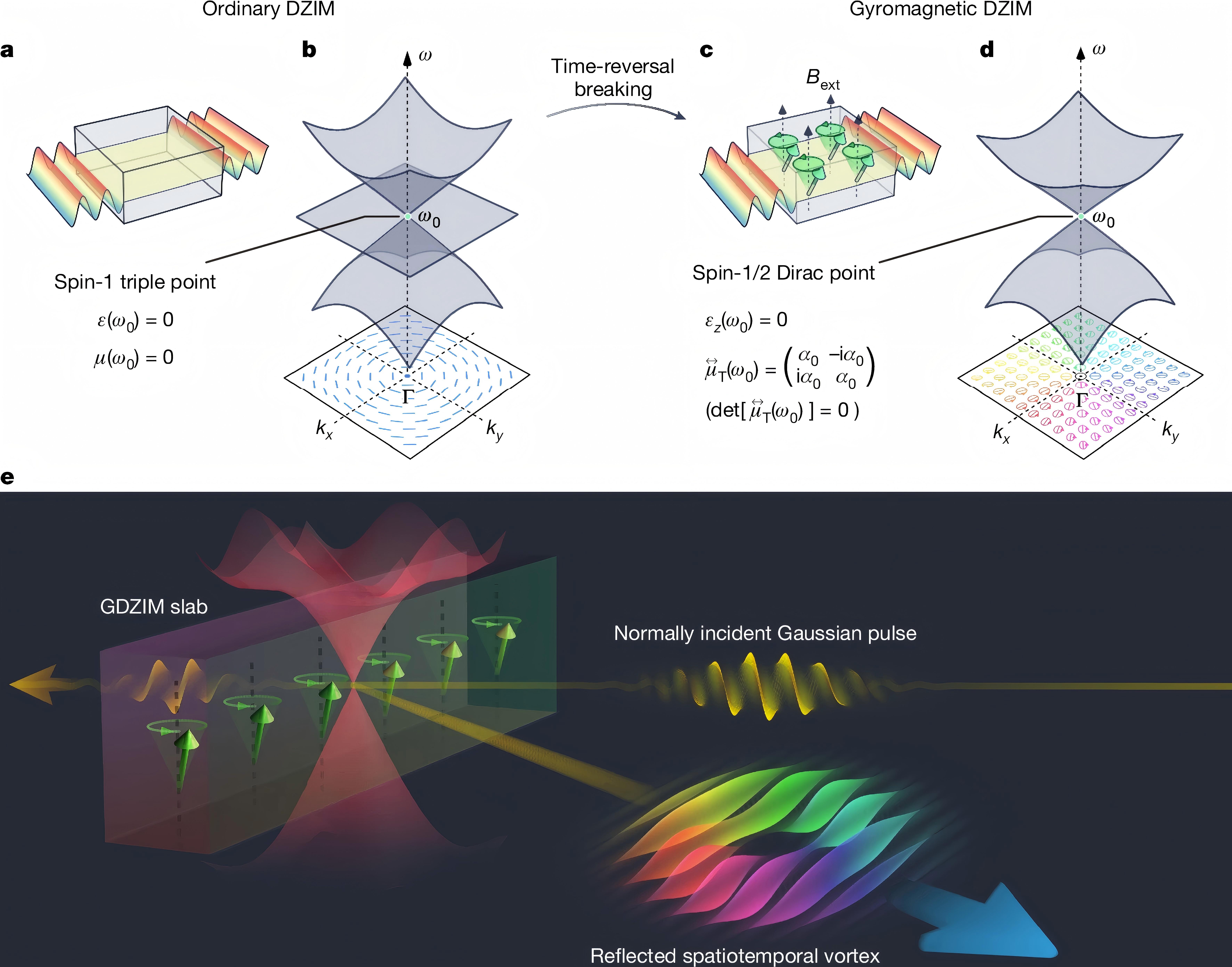 圖1. 傳統(tǒng)雙零折射率超材料與旋磁雙零折射率超材料對(duì)比,及利用旋磁雙零超材料產(chǎn)生時(shí)空光渦旋
