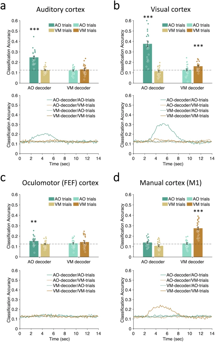 圖3. 多重需求網絡中單任務與雙任務的神經解碼時間序列研究采用多變量模式分析方法來追蹤任務特異性的神經活動。