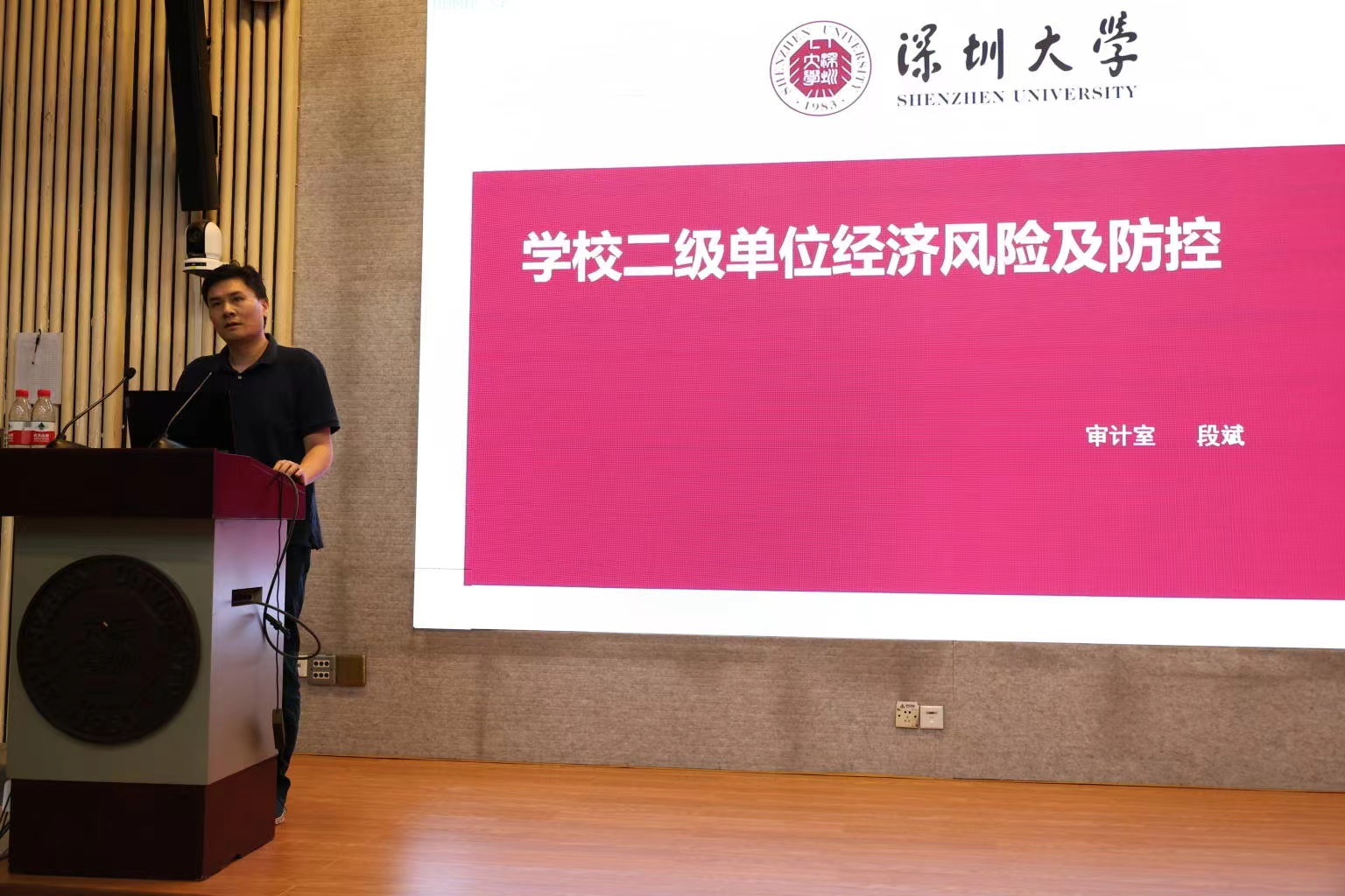 學校審計室主任段斌以《學校二級單位經濟風險及防控》為題對合規建設工作中的重點問題進行了闡述,詳細列舉了二級單位面臨的主要經濟風險,提出了依規決策、完善內控機制、信息公開和加強合規文化建設等四個方面的風險防控建議。